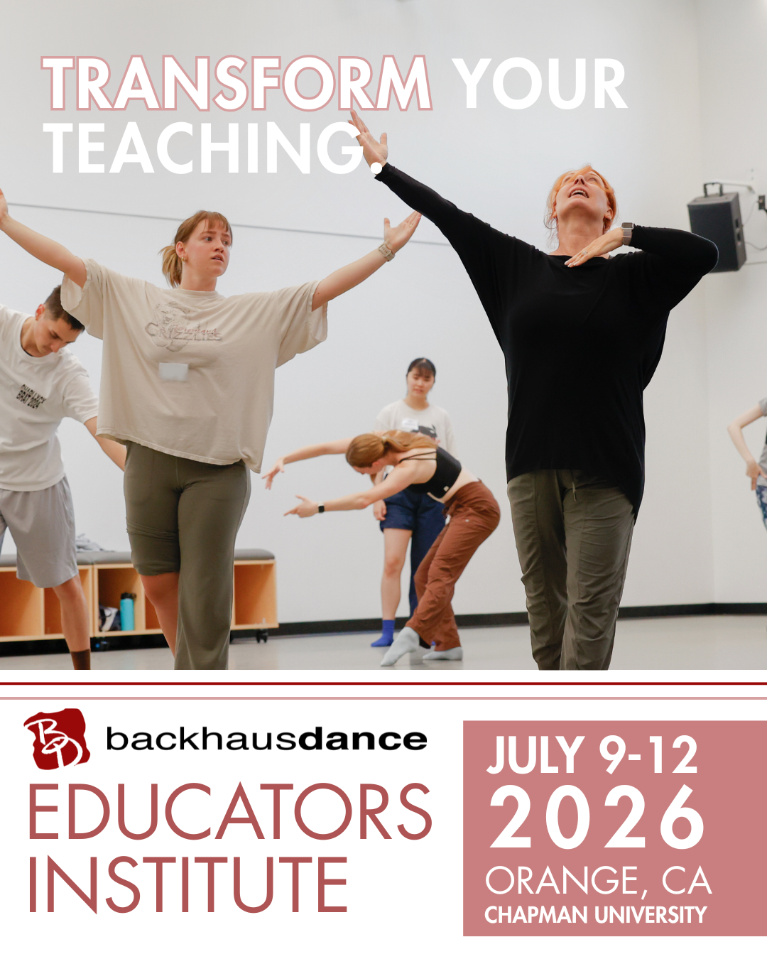 Back to All Events Backhausdance Educators Institute Thursday, July 9, 2026 9:00 AM Sunday, July 12, 2026 7:00 PM Backhausdance PO Box 5890 Orange, CA 92863 (map) Google Calendar ICS BACKHAUSDANCE EDUCATORS INSTITUTE 2026A four-day professional learning experience designed for K-12 and collegiate dance educators who want to elevate their teaching and renew their passion for dance.July 9 - 12, 2026Learn more and register! Learn more